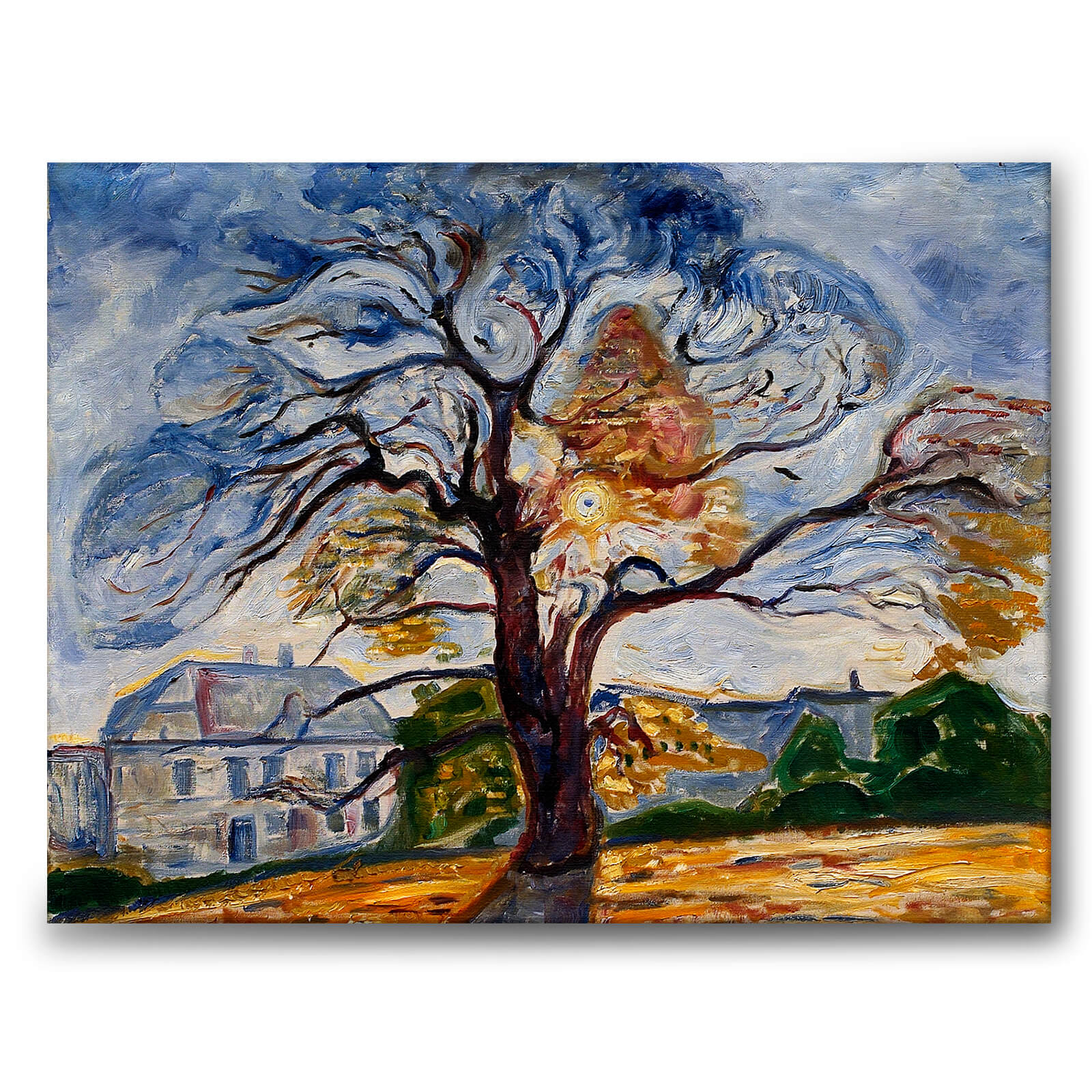 Canvastavla med målningen Eken av Edvard Munch. Verket föreställer en ståtlig ek framför en sol. Gräset och de få löven som trädet har kvar är gula vilket tyder på att det är höst om inte en långvarig sommartorka.