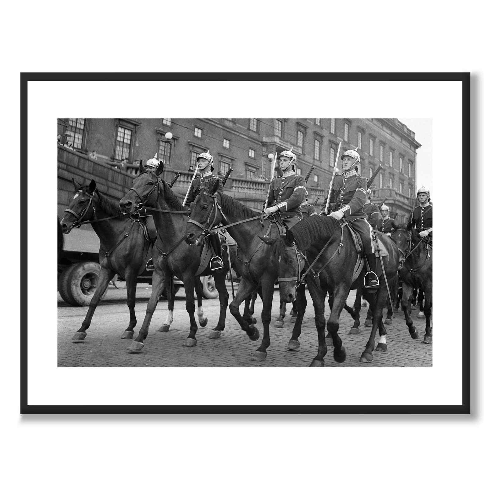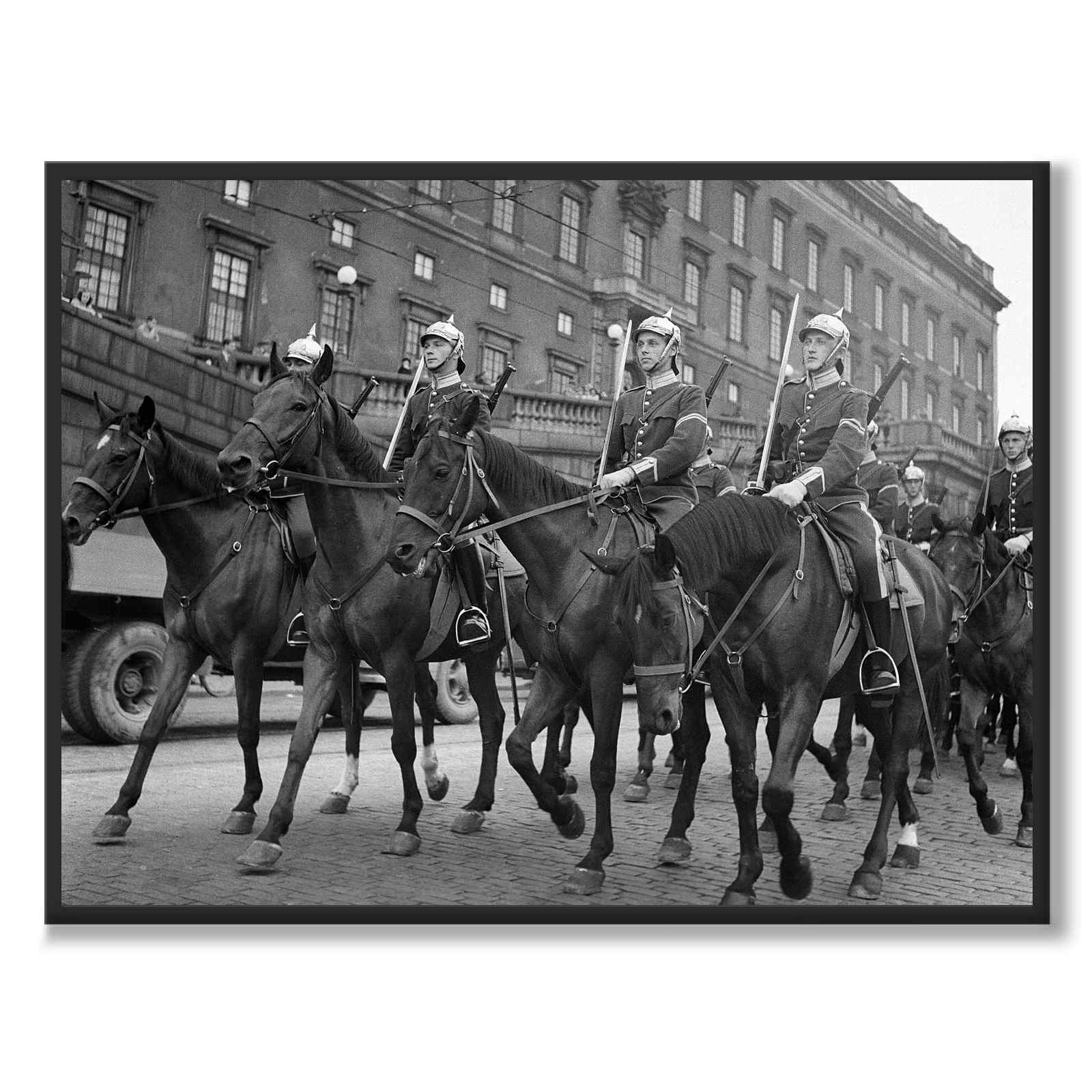 I bilden ser vi vaktparaden passera Stockholms slott på väg till vaktavlösningen. Soldaterna rider framåt på kullerstensgatan iförda uniform, hjälm och sabeln mot axeln.