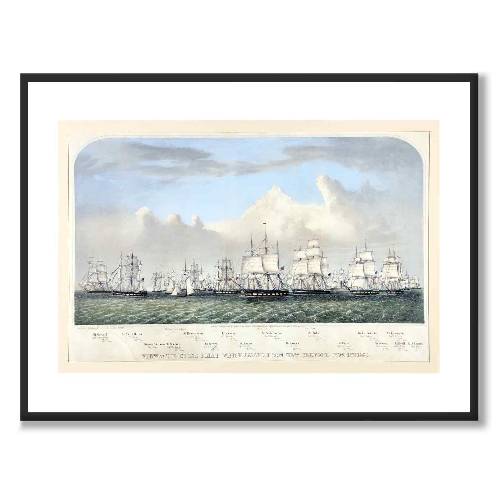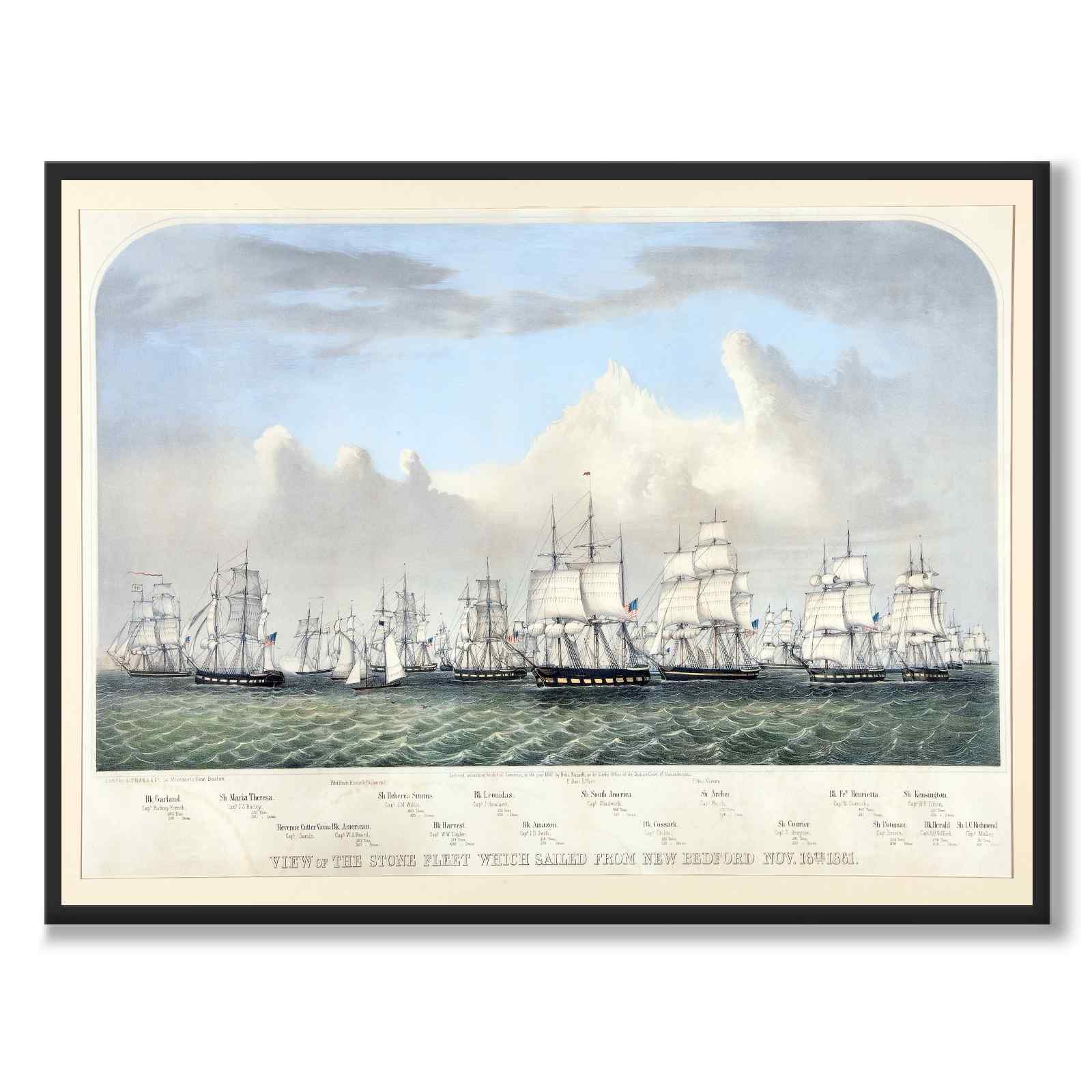 Målningen skildrar en flotta av segelfartyg som utgjorde Stone Fleet, en grupp av gamla handelsfartyg som skickades iväg under det amerikanska inbördeskriget. Dessa fartyg användes för att blockera hamnar och hindra fiendens sjöfart, och var en viktig del av marina krigsstrategier under denna tid.
