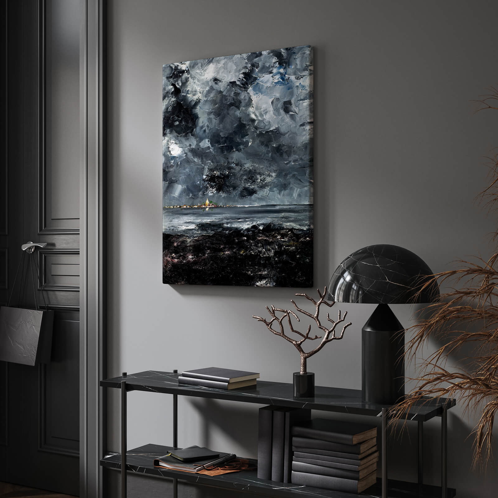 På bilden ser vi ett mörkt landskap med en himmel fylld av stora molnformationer i vitt, svart och grått. Bildens nedre del består av en vattenyta och i förgrunden en mörk strandkant. I horisonten ser vi en stad. Staden ser ut att sväva på vattnet, som en hägring. Staden – som symboliserar civilisation, kultur och liv – är mycket avlägsen. Som åskådare befinner vi oss i ett mörkt landskap på långt avstånd från det civiliserade samhället.