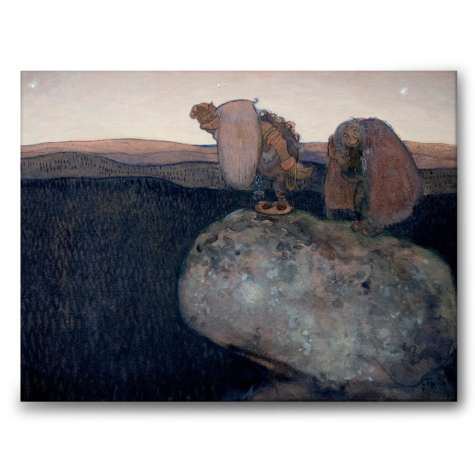 Canvastavla med målningen Trollen i Domberget vänta främmande av John Bauer från cirka 1907. Motivet visar två troll som blickar ut över ett vidsträckt skogslandskap i skymning. De lyssnar noggrant efter ljud från skogen. Vem letar de efter? John Bauer är känd för sina sagomotiv med troll och prinsessor och han har haft stor påverkan på svensk folklore och sagoberättande.
