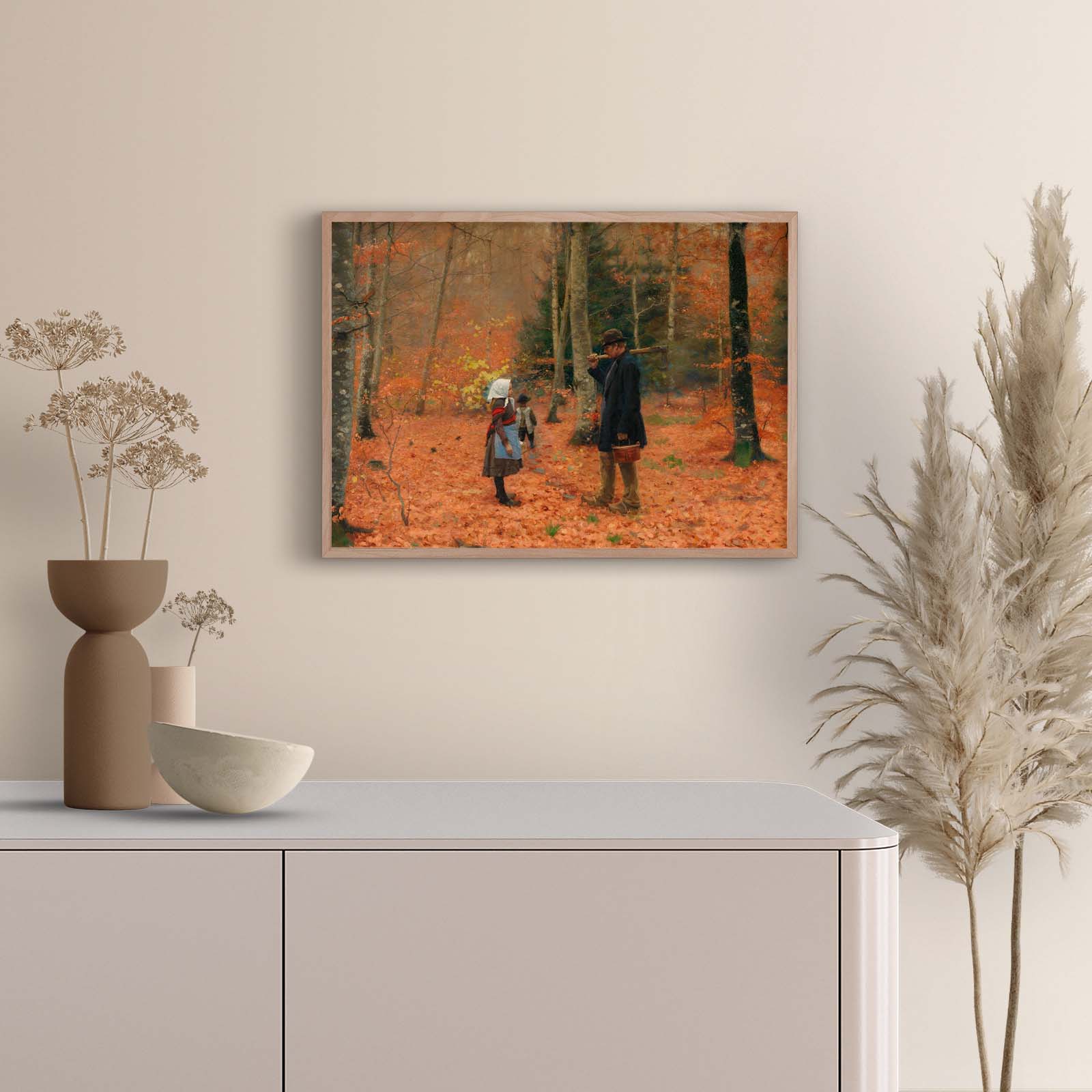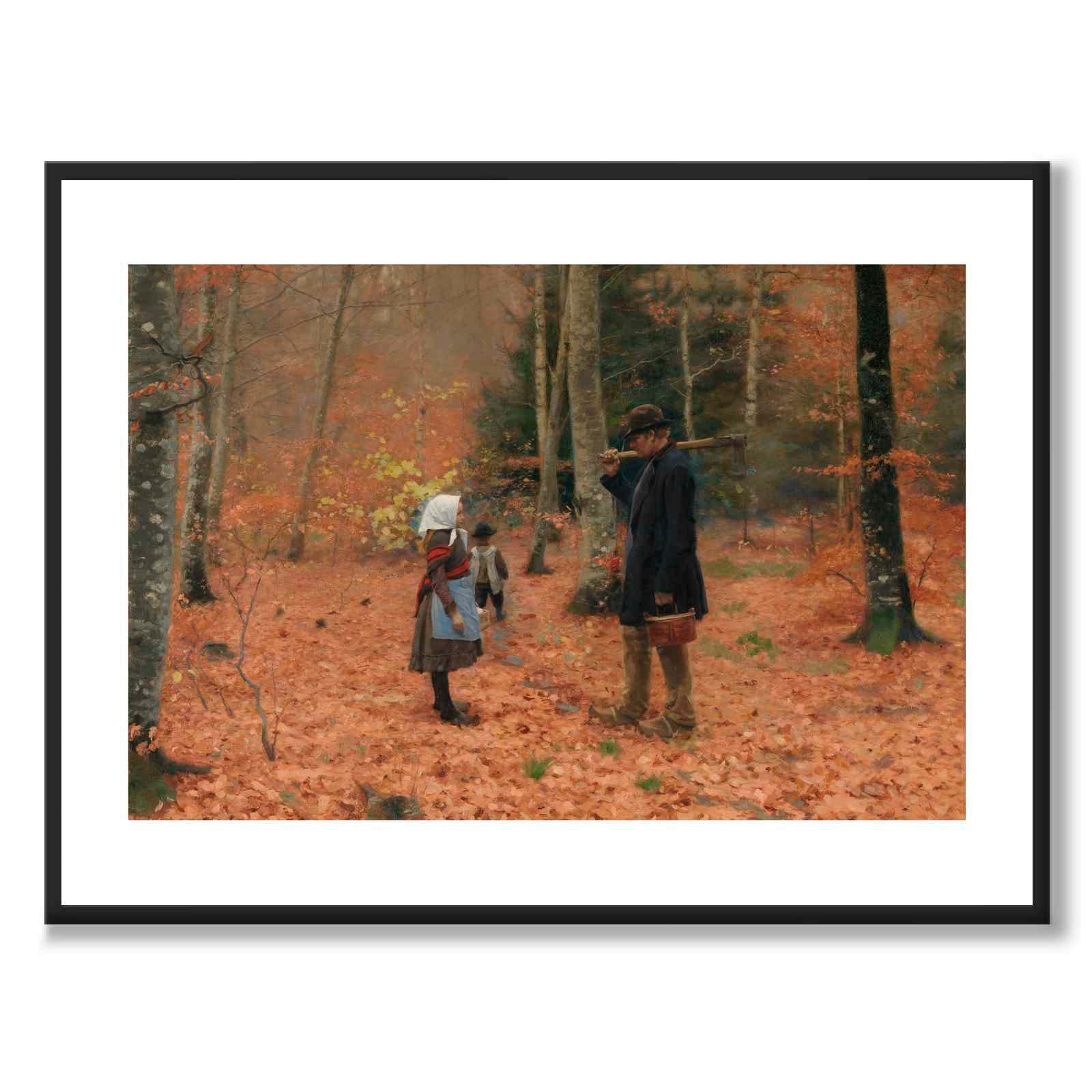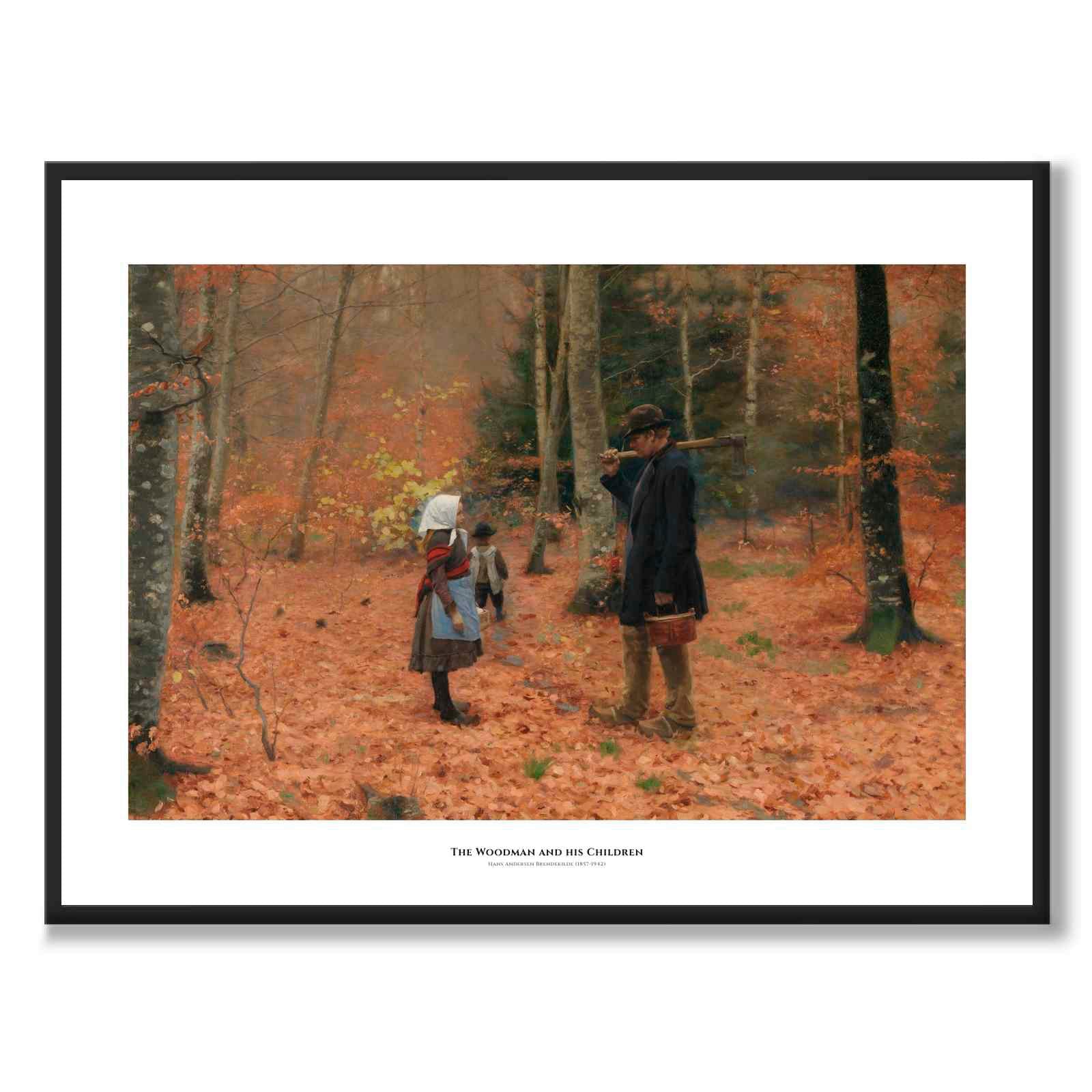 Poster med den vackra målningen Skogsarbetaren och hans barn av Hans Andersen Brendekilde (1857-1942). På målningen syns en skogsarbetare som pratar med sin dotter i ett fantastiskt höstlandskap med djupa orangea toner kombinerat med gråa trädstammar och vackert gröna granar.