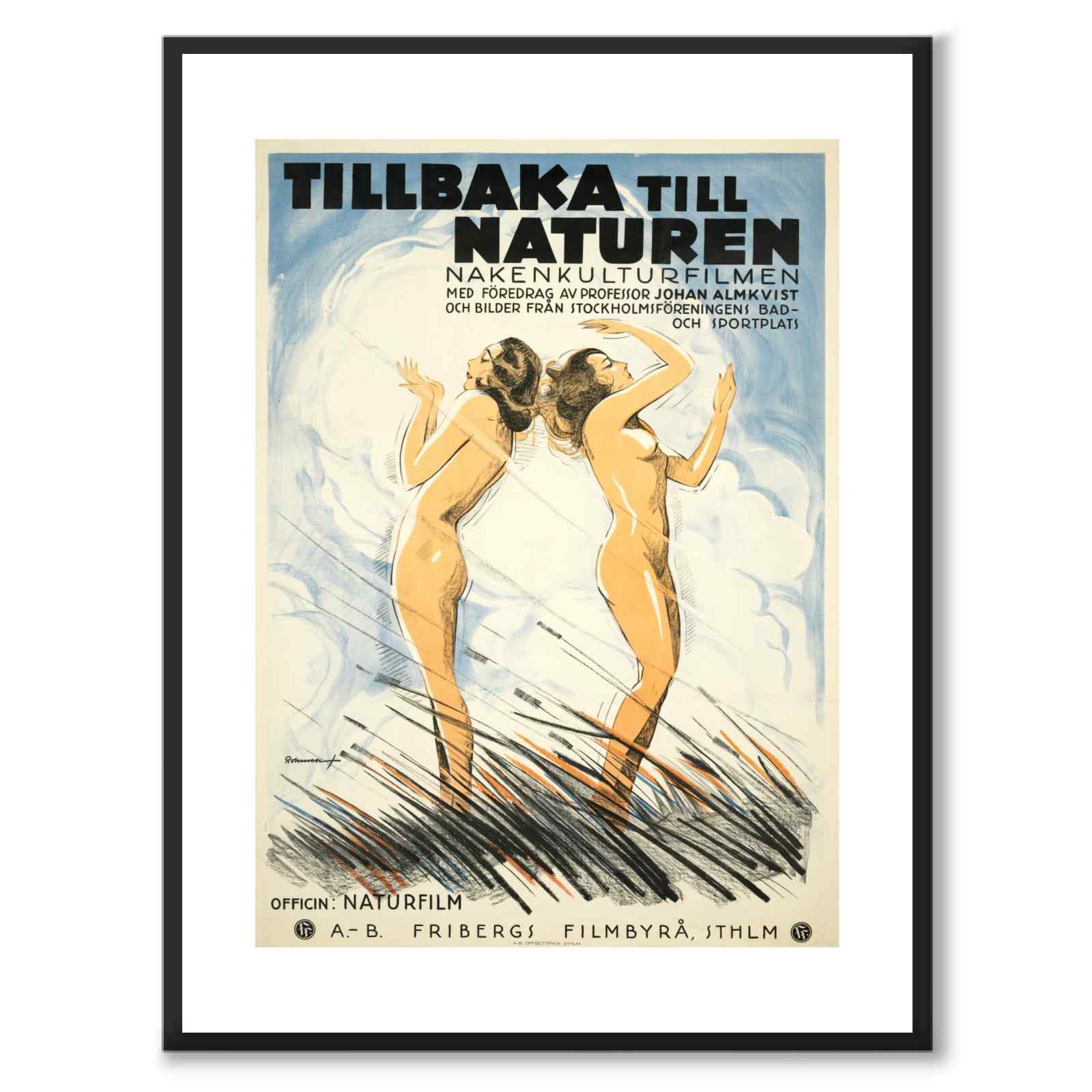 Poster med Tillbaka till Naturen, en nakenkulturfilm från 1930-talet. På postern står det Nakenkulturfilmen: med föredrag av Professor Johan Almkvist och bilder från Stockholmsföreningens Bad-och Sportsplats.