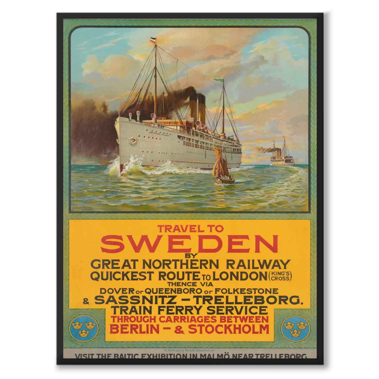 Affischen marknadsför resor till Sverige med tåg och färja via bland annat Trelleborg som var en viktig port för internationell järnväg och färjetrafik till kontinenten, särskilt mellan Sassnitz i Tyskland och Trelleborg i Sverige.