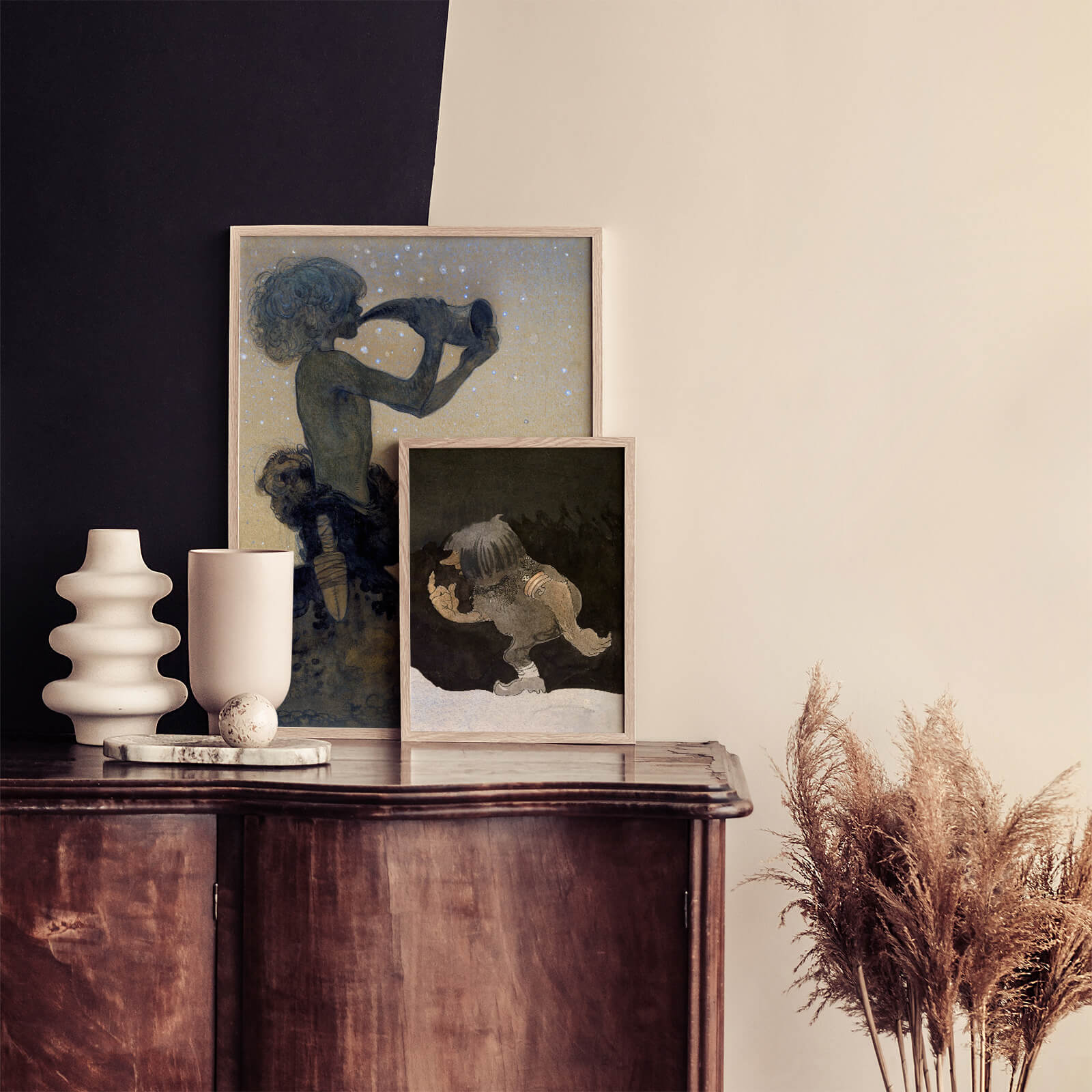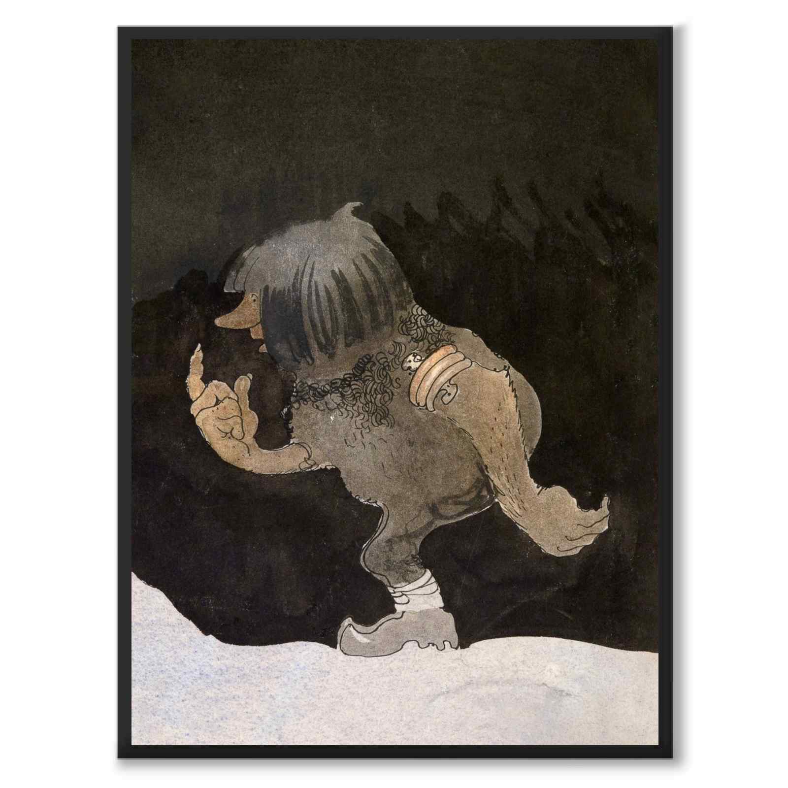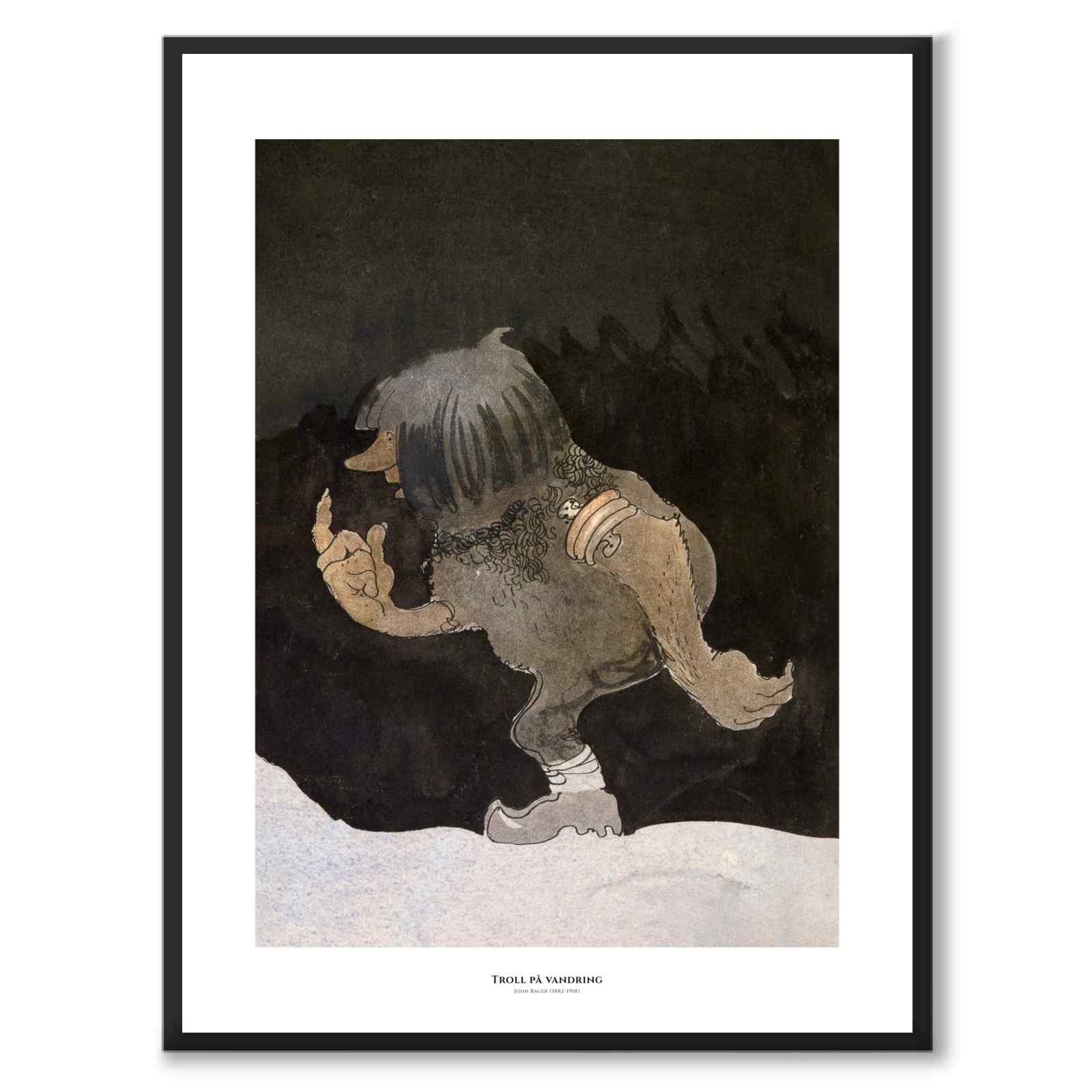 Poster med målningen Troll på vandring av John Bauer. I bilden ser vi ett troll som står i ett mörkt och snötäckt vinterlandskap. Bakom honom ligger den djupa granskogen utbredd.