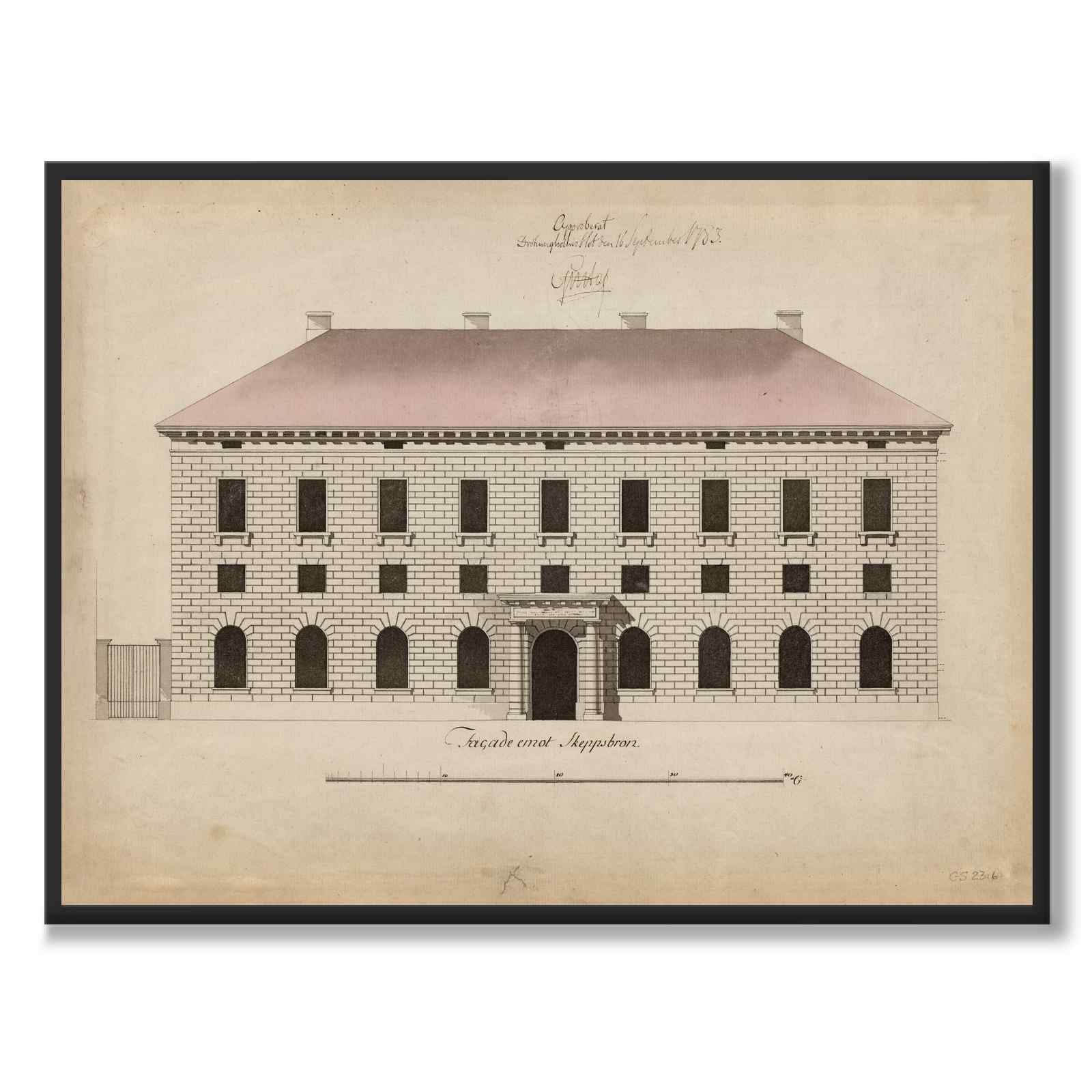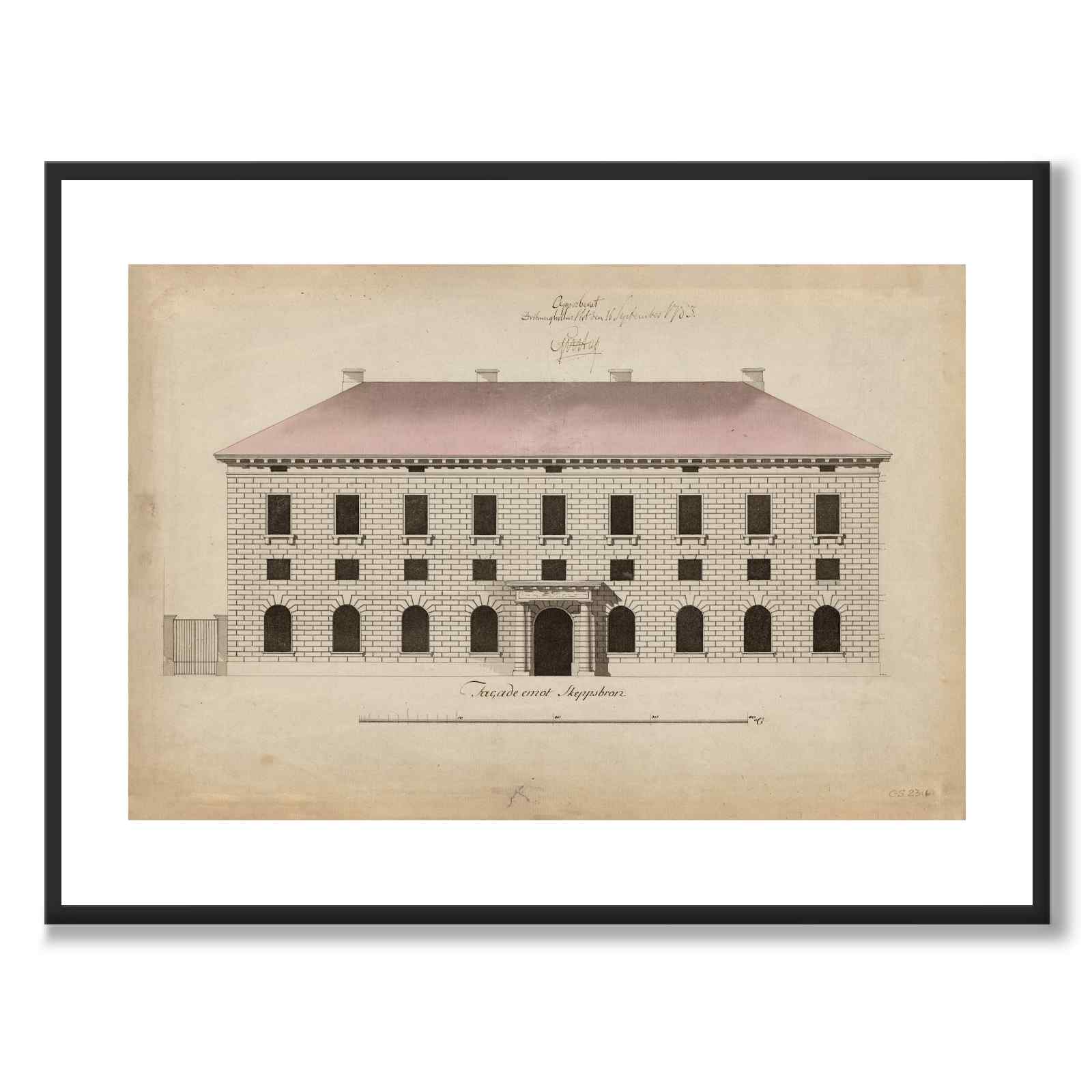 Postern visar en ritning av Tullpackhuset på Skeppsbron i Stockholm, ritad av arkitekten Erik Palmstedt år 1783. Byggnaden är ett exempel på neoklassicism, inspirerad av den italienska renässans arkitekten Andrea Palladio och nyantikens ideal.