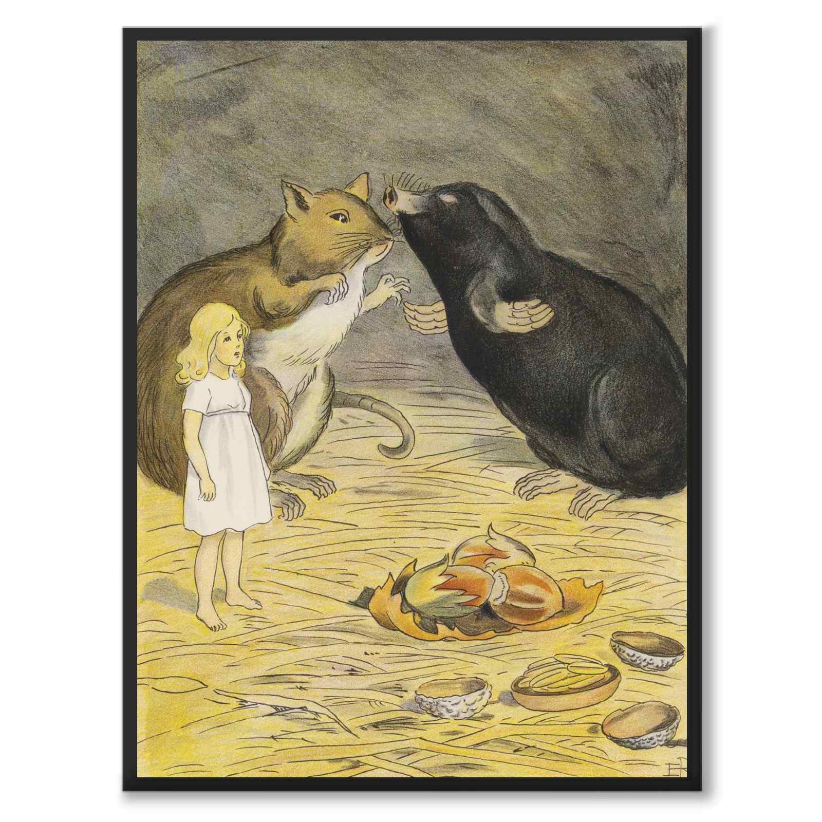 Poster med motiv från den klassiska sagan Tummelisa, skriven av den världsberömda danska författaren H.C. Andersen. Tummelisa, ursprungligen publicerad 1835, är en av Andersens mest älskade berättelser. Illustrationerna ur den här upplagan från år 1924 är ritade av ingen mindre än svenska ikonen Elsa Beskow, vars arbete som författare och illustratör har blivit klassiker inom svensk barnlitteratur.
