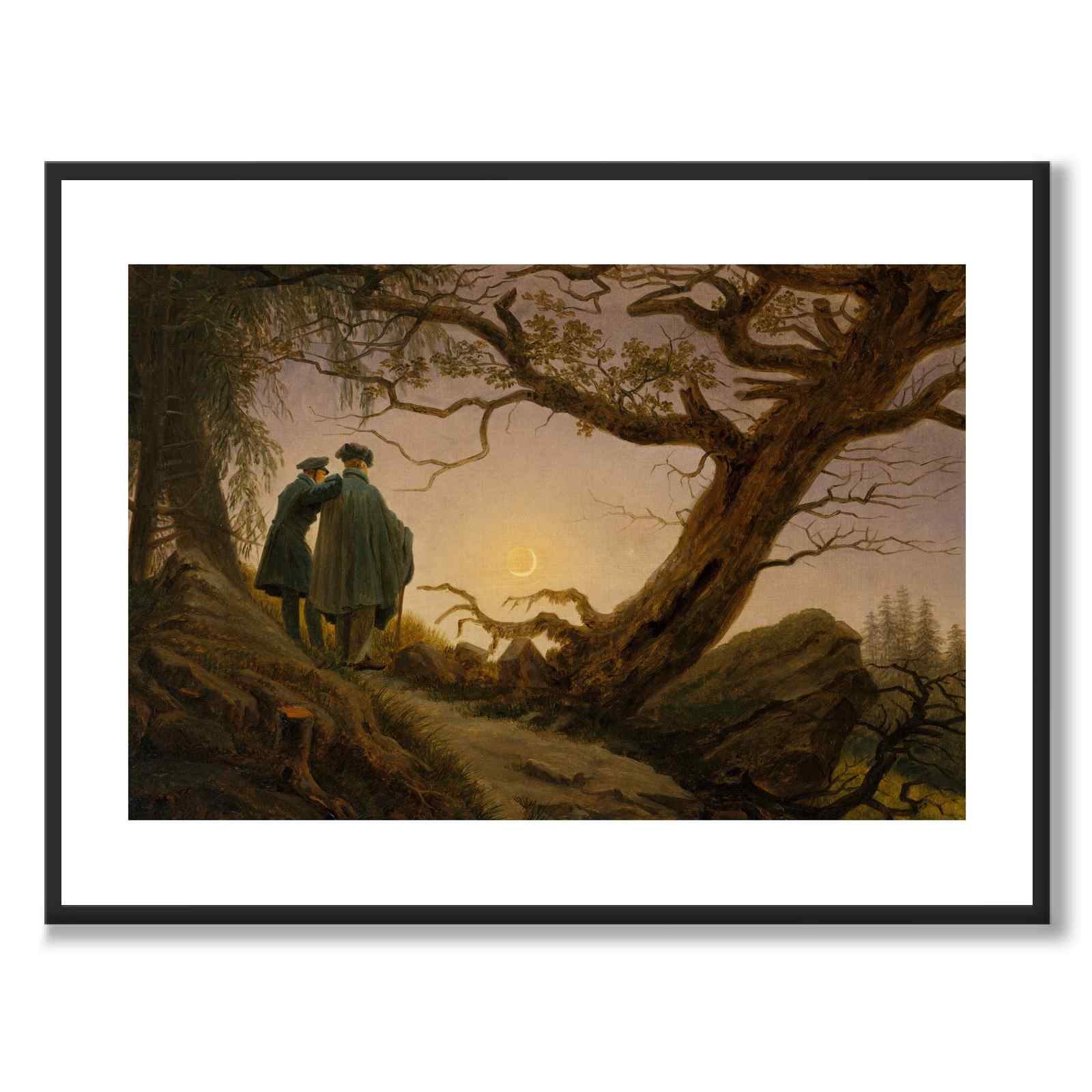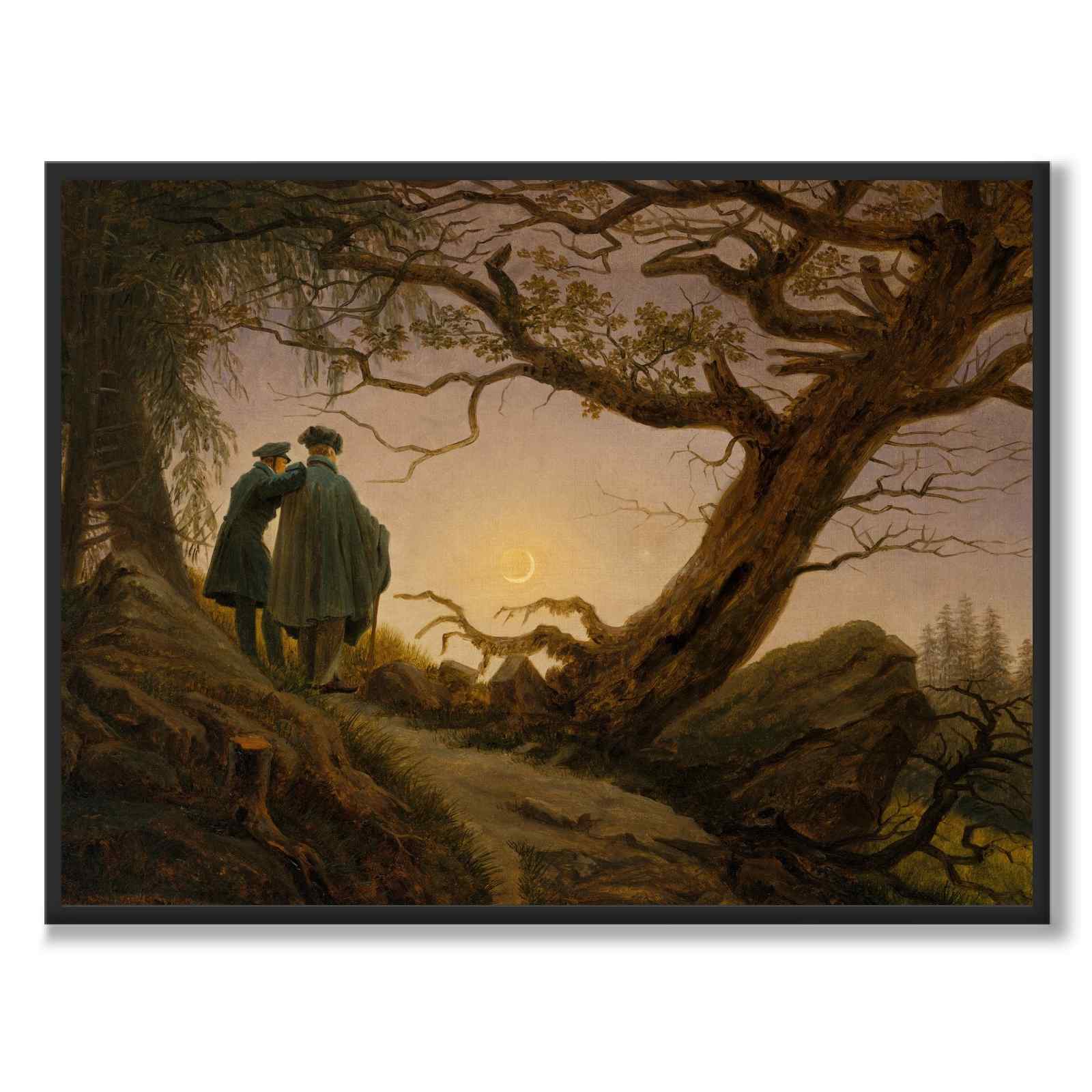 Poster med den vackra tavlan Two Men Contemplating the Moon. Målningen är skapad av den tyska konstnären Caspar David Friedrich runt 1825-30. Friedrich anses vara en av romantikens mest berömda landskapsmålare.