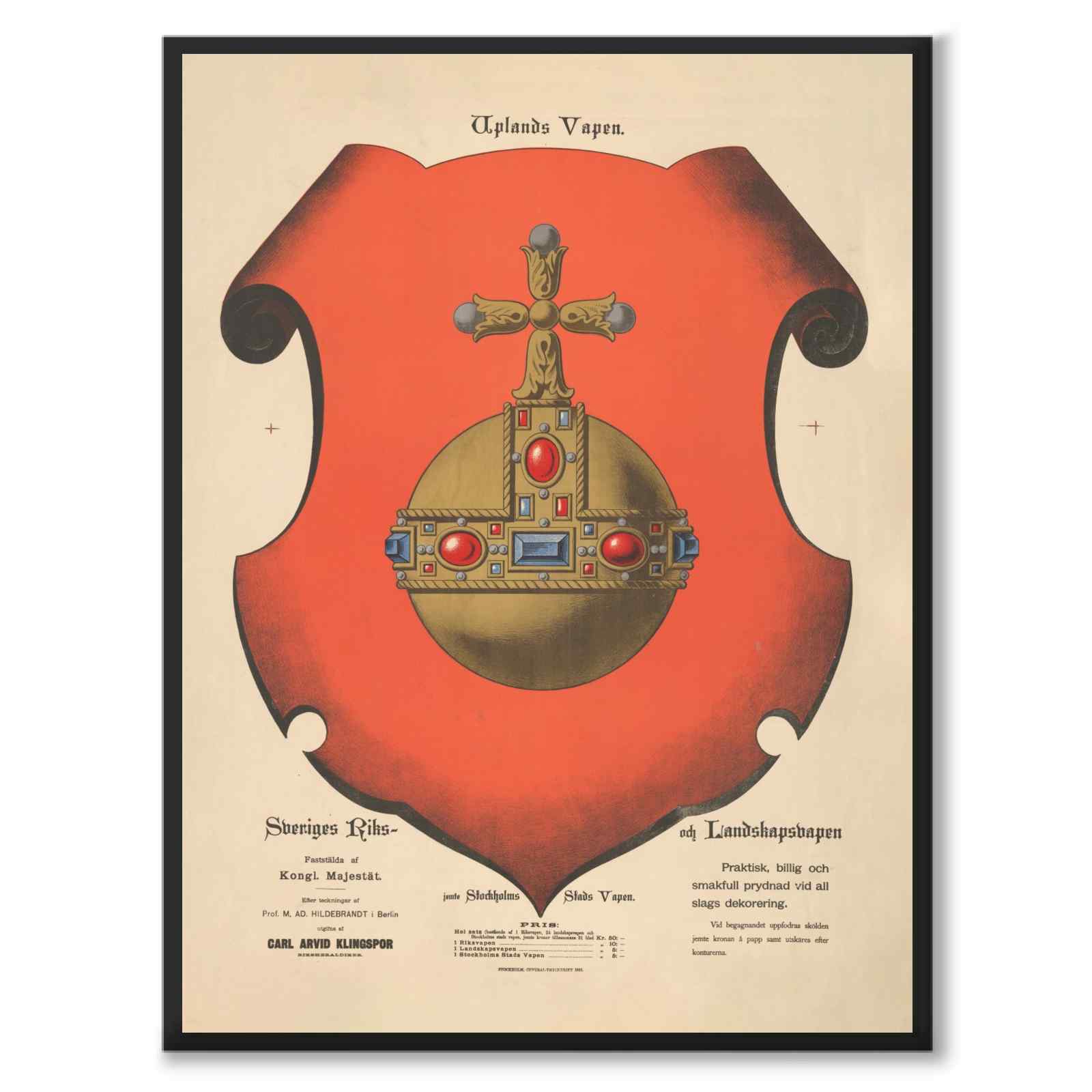 Texten ovanför vapnet lyder: "Uplands Vapen". Längst ner till vänster står det: "Sveriges Riks- och Landshapensvapen. Fastställda af Kongl. Majestät. Efter teckningar af Prof. M. AD. Hildebrandt i Berlin. Utgifna af Carl Arvid Klingspor."