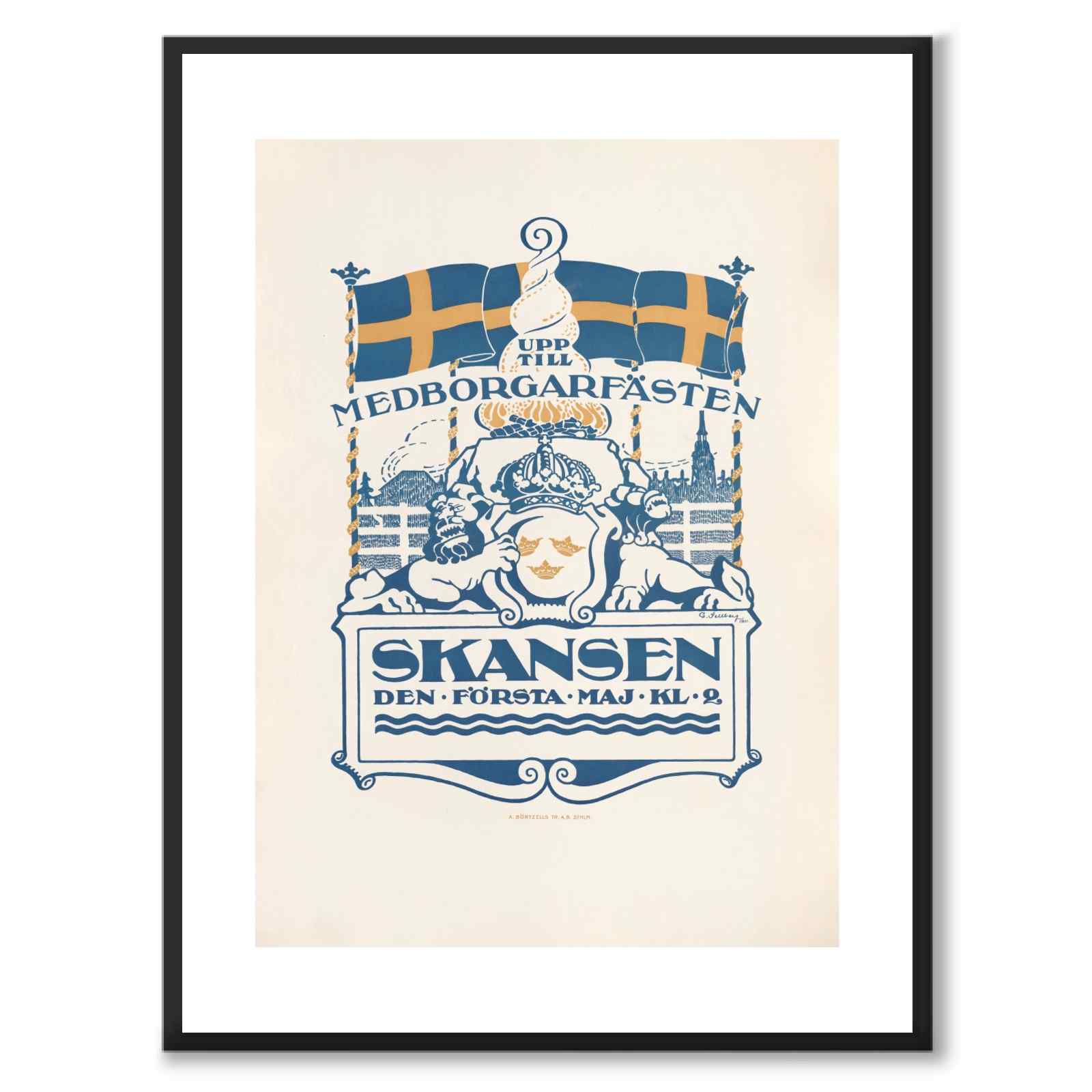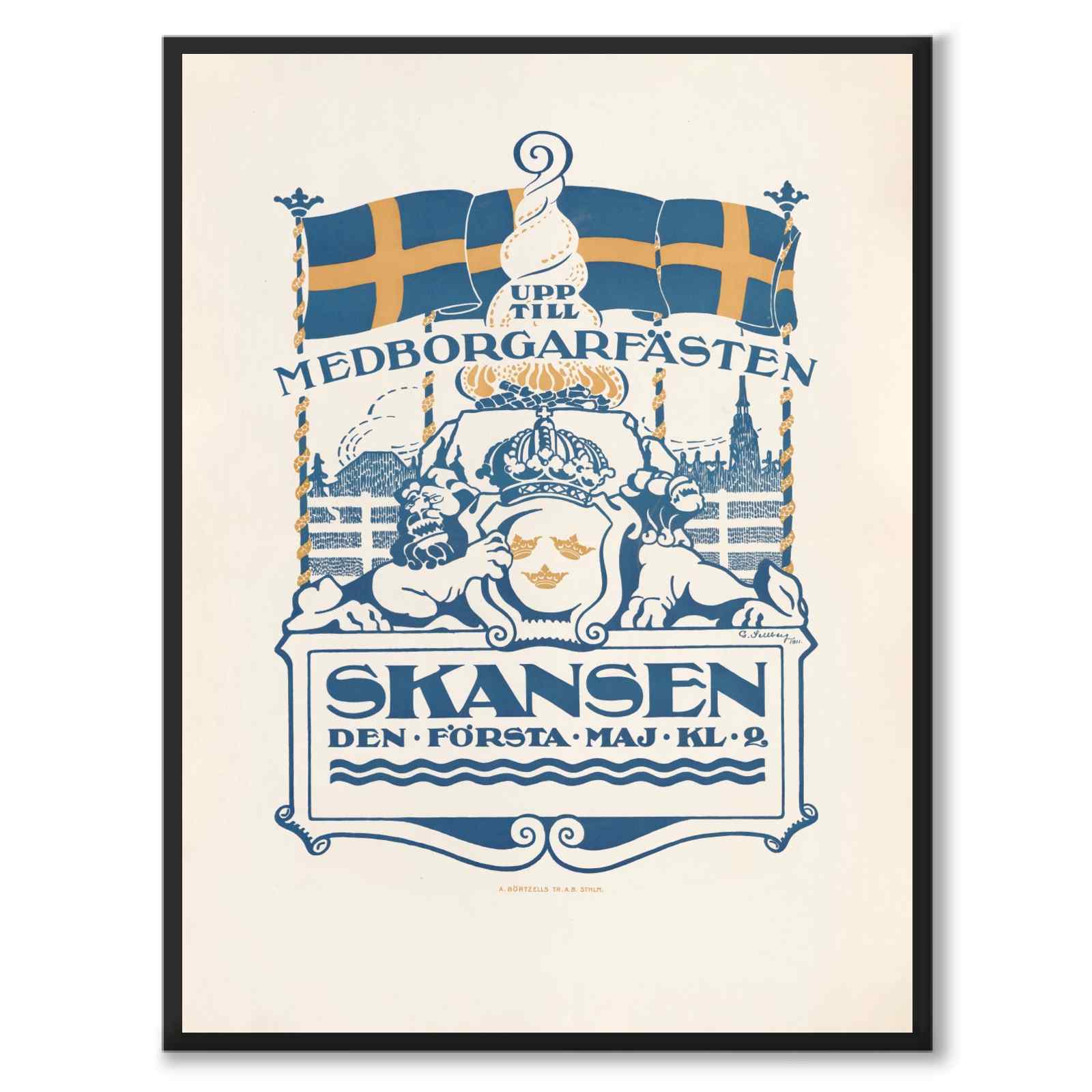 Poster med en illustrerad affisch om evenemanget Upp till Medborgarfesten på 1910-talet. Enligt affischen ska festen ha ägt rum på Skansen i Stockholm den första maj klockan två.