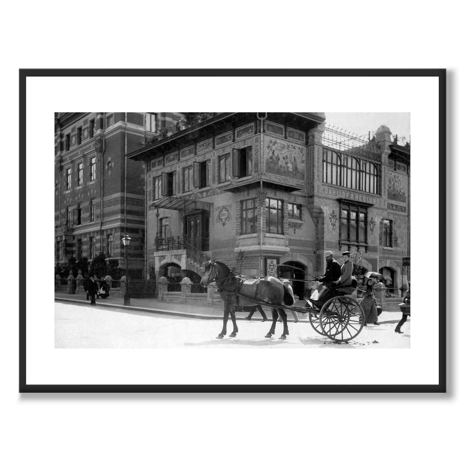 Poster med ett ekipage med häst och vagn framför Tomtehuset, Vasagatan i Göteborg. Fotografiet är taget av Dahllöf & Hedlund på 1890-talet.