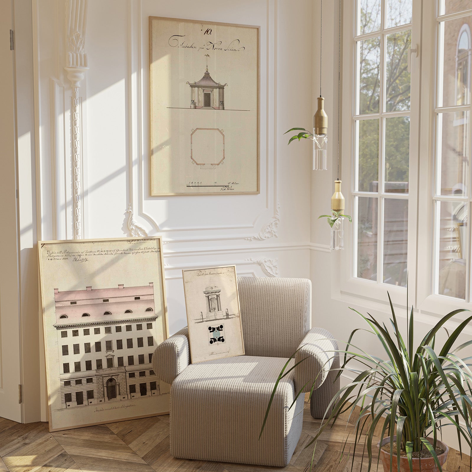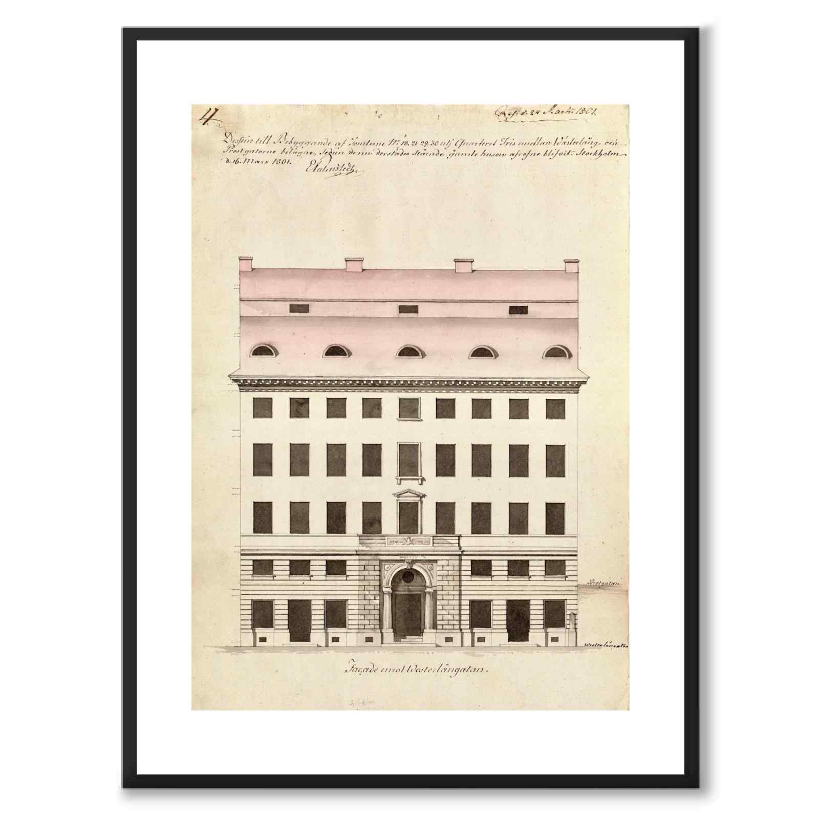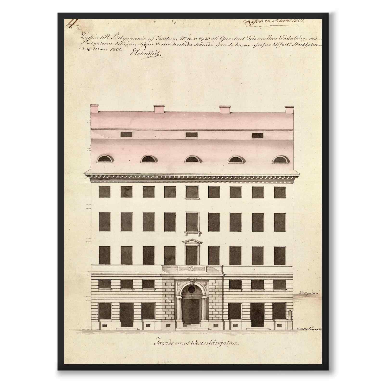 Postern visar en ritning av ett hus ritat av Erik Palmstedt för sig själv och sin familj år 1801. Detta var ett av de sista projekten i hans karriär. Palmstedt, en av Sveriges mest framstående arkitekter under 1700- och 1800-talet, skapade denna byggnad på Västerlånggatan 27 i Stockholm.