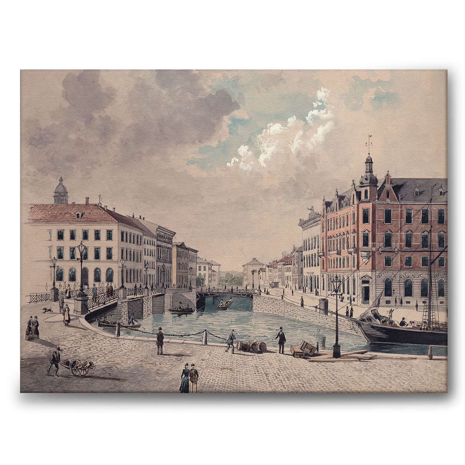 Canvas med en vacker målning av Västra Hamnkanalen och Västra Hamngatan i Göteborg. Konstverket är skapat av den danske konstnären Ludvig Messmann år 1890 och är en del av en hel serie med vackra Göteborgsmotiv.