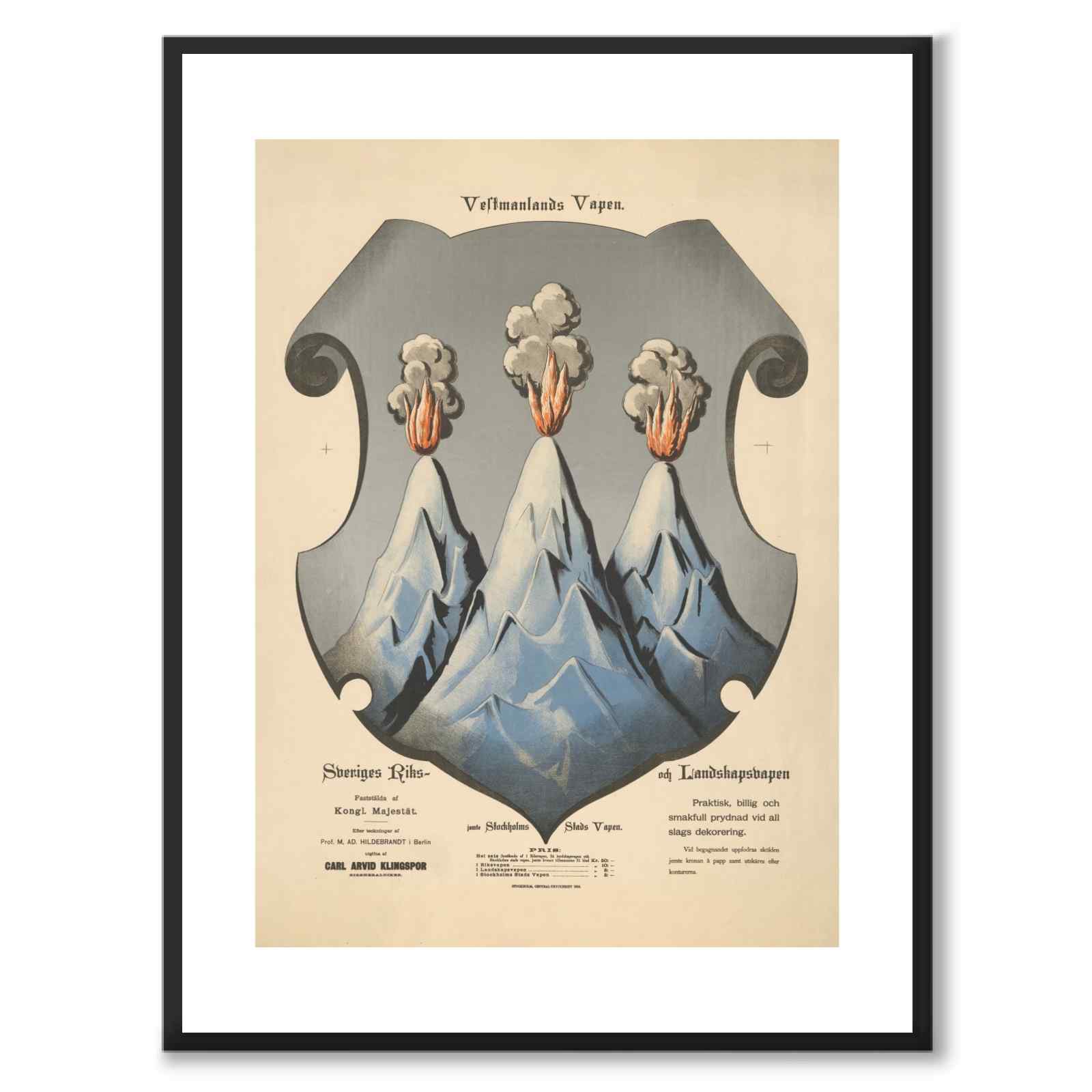 Texten ovanför vapnet lyder: Vestmanlands Vapen. Längst ner till vänster står det: "Sveriges Riks- och Landskapsvapen. Fastställda af Kongl. Majestät. Efter teckningar af Prof. M. AD. Hildebrandt i Berlin. Utgifna af Carl Arvid Klingspor."