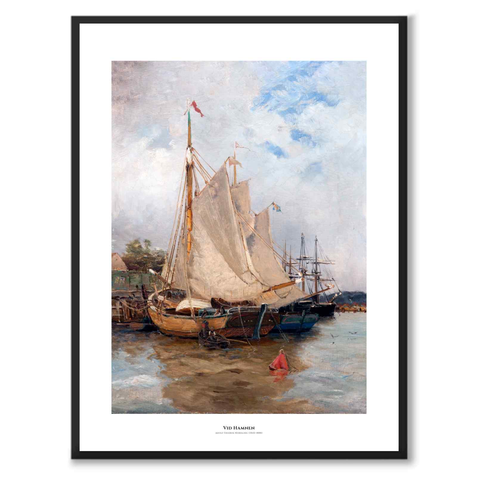 Poster med den vackra målningen In the Harbour, eller den svenska titeln: Vid Hamnen. Målningen är skapad 1884 av Adolf Fredrik Nordling, en svensk målare.