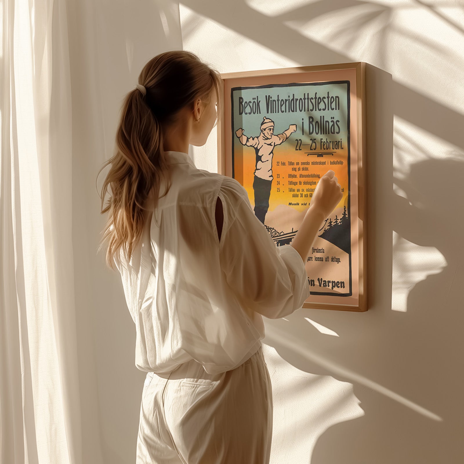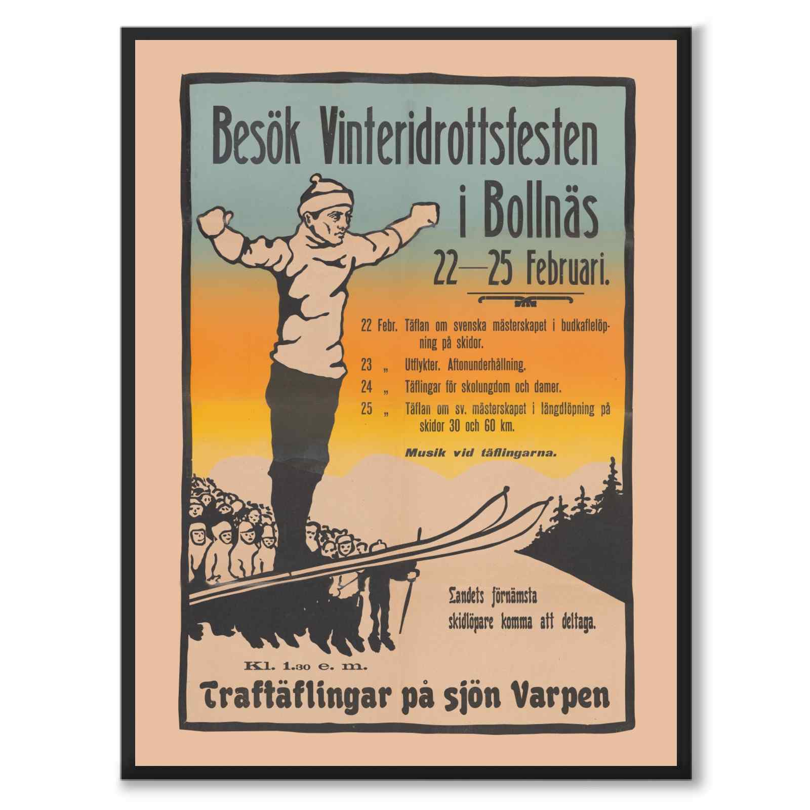 Poster med en vintage evenemangsaffisch för Vinteridrottsfesten i Bollnäs. Detta evenemang hölls mellan den 22 till 25 februari 1912 och på affischen kan vi se att "landets förnämsta skidlöpare komma att deltaga".