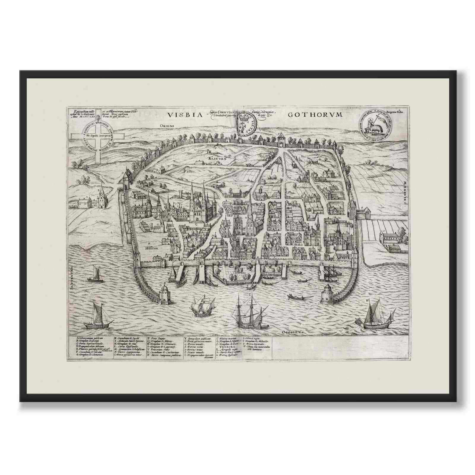 Poster med en vacker karta över Visby på Gotland, illustrerad 1598 av Georg Braun och Franz Hogenberg.