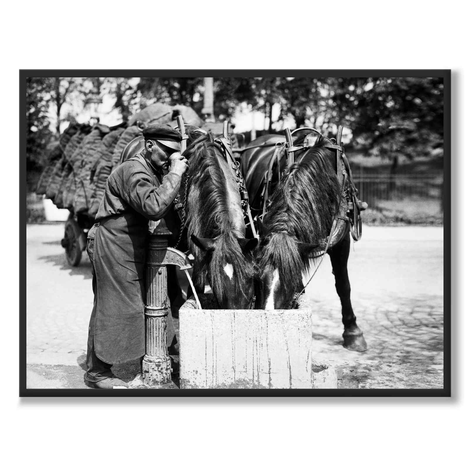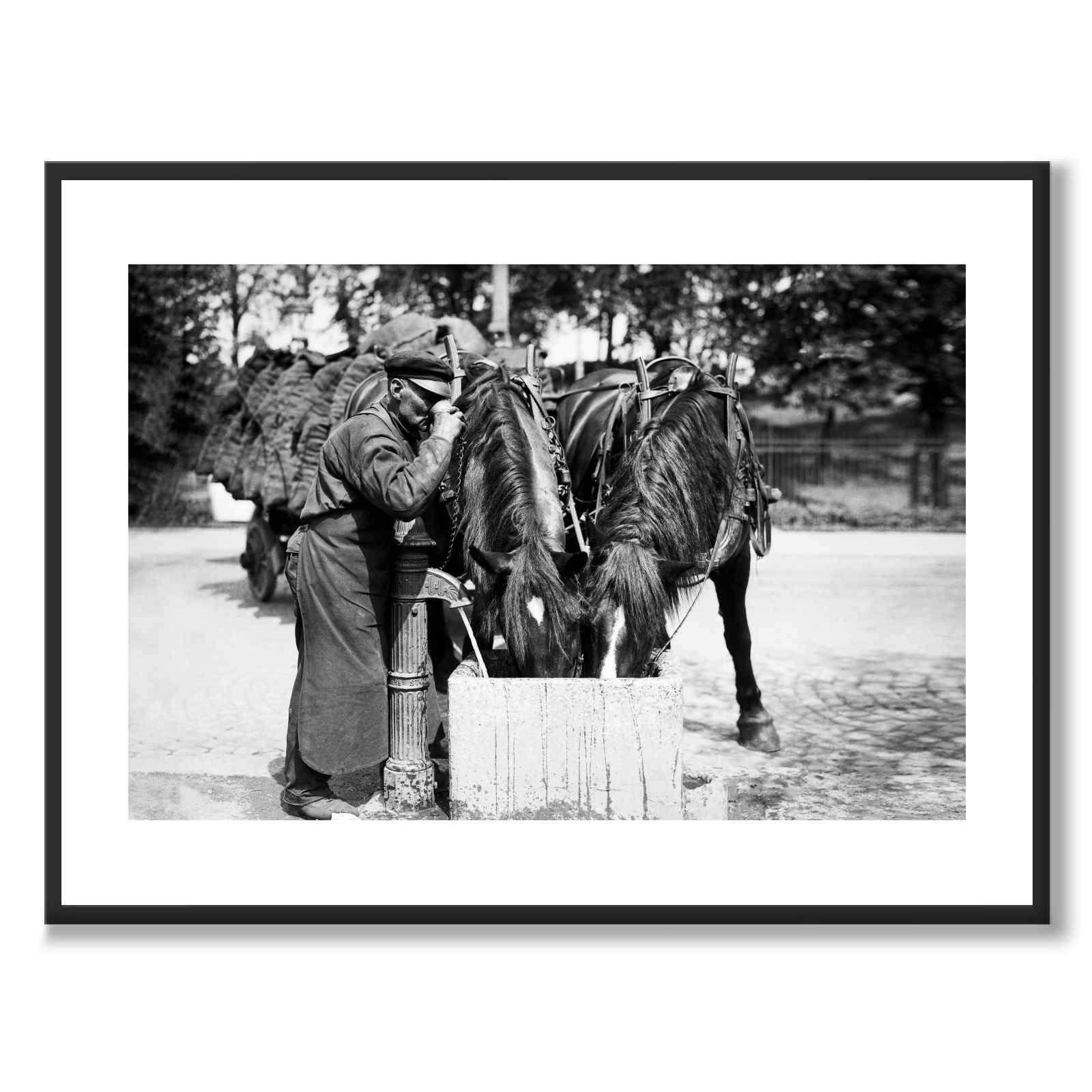 Två hästar och en man dricker vid en vattenpost. Bilden är tagen vid en värmebölja i Stockholm år 1934.