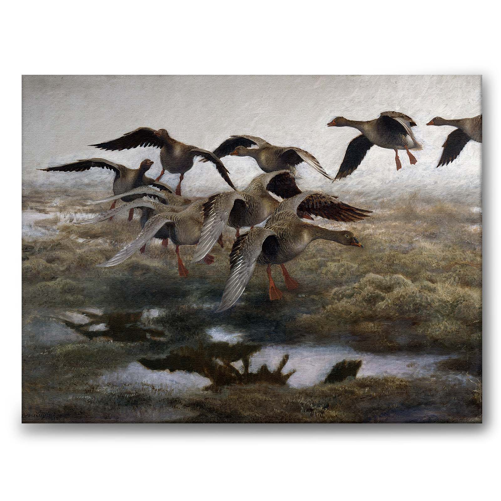 Exklusiv canvastavla med en vacker målning från 1907, målad av Bruno Liljefors. Motivet föreställer en flock vildgäss som landar på en vacker myr en dimmig dag.